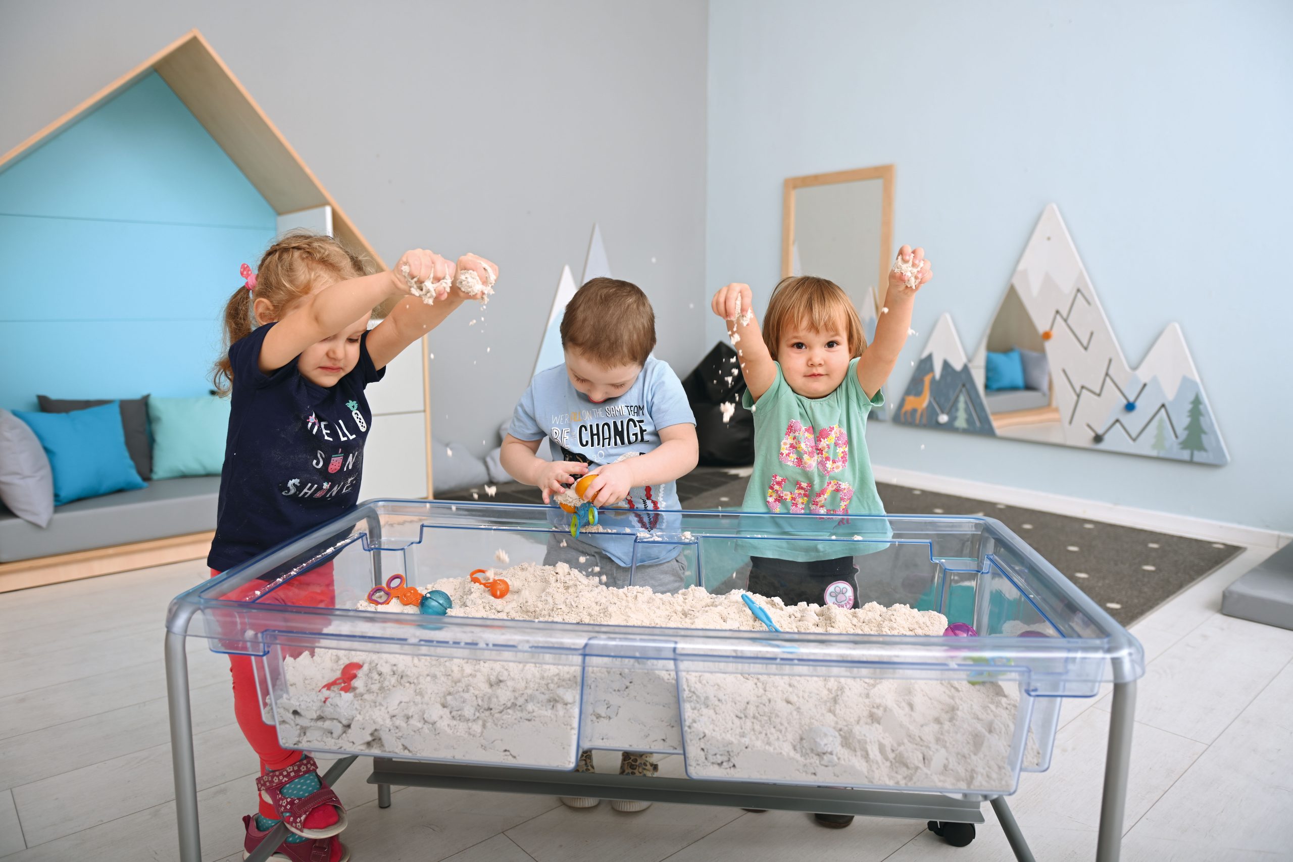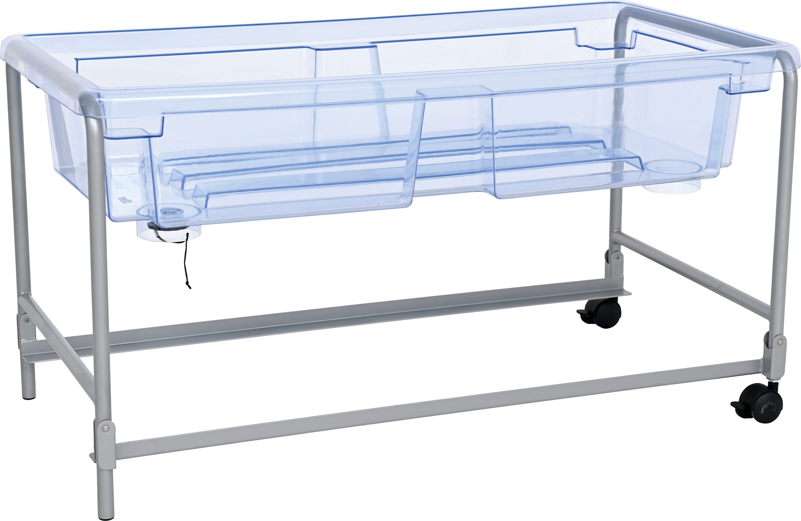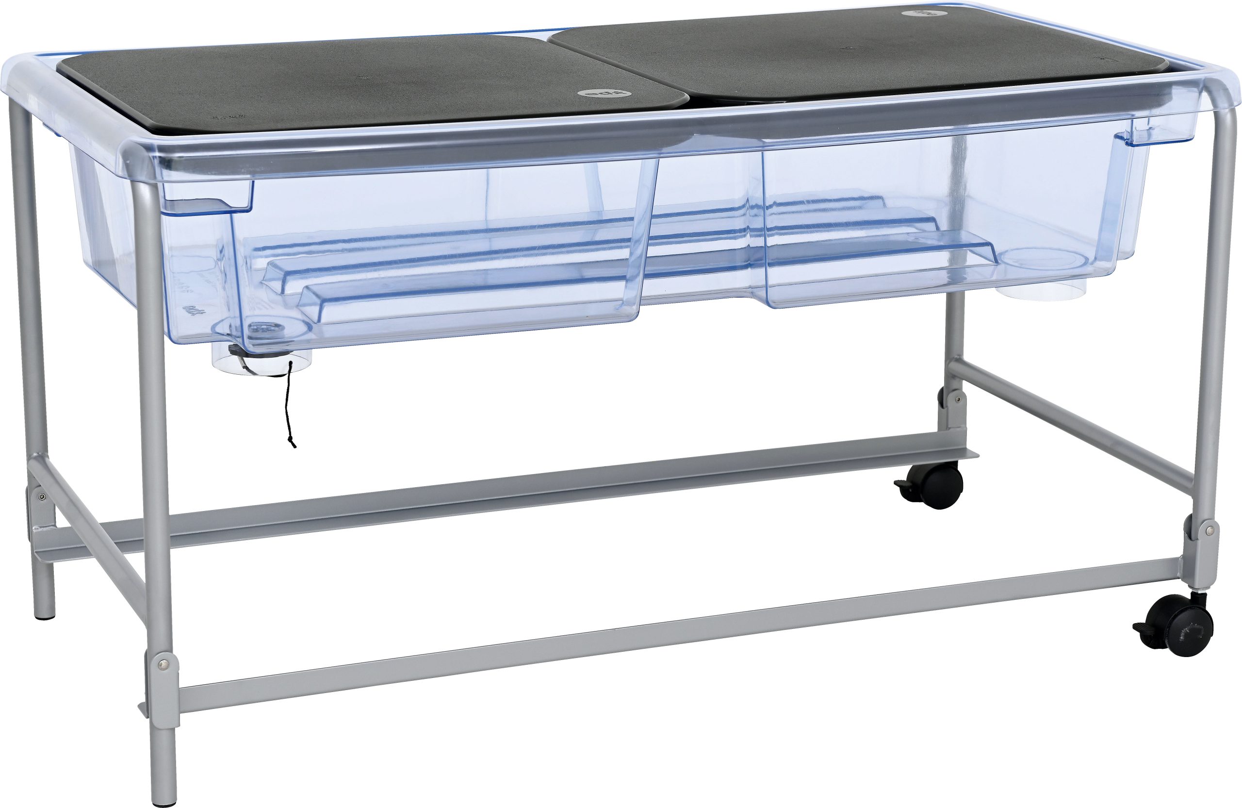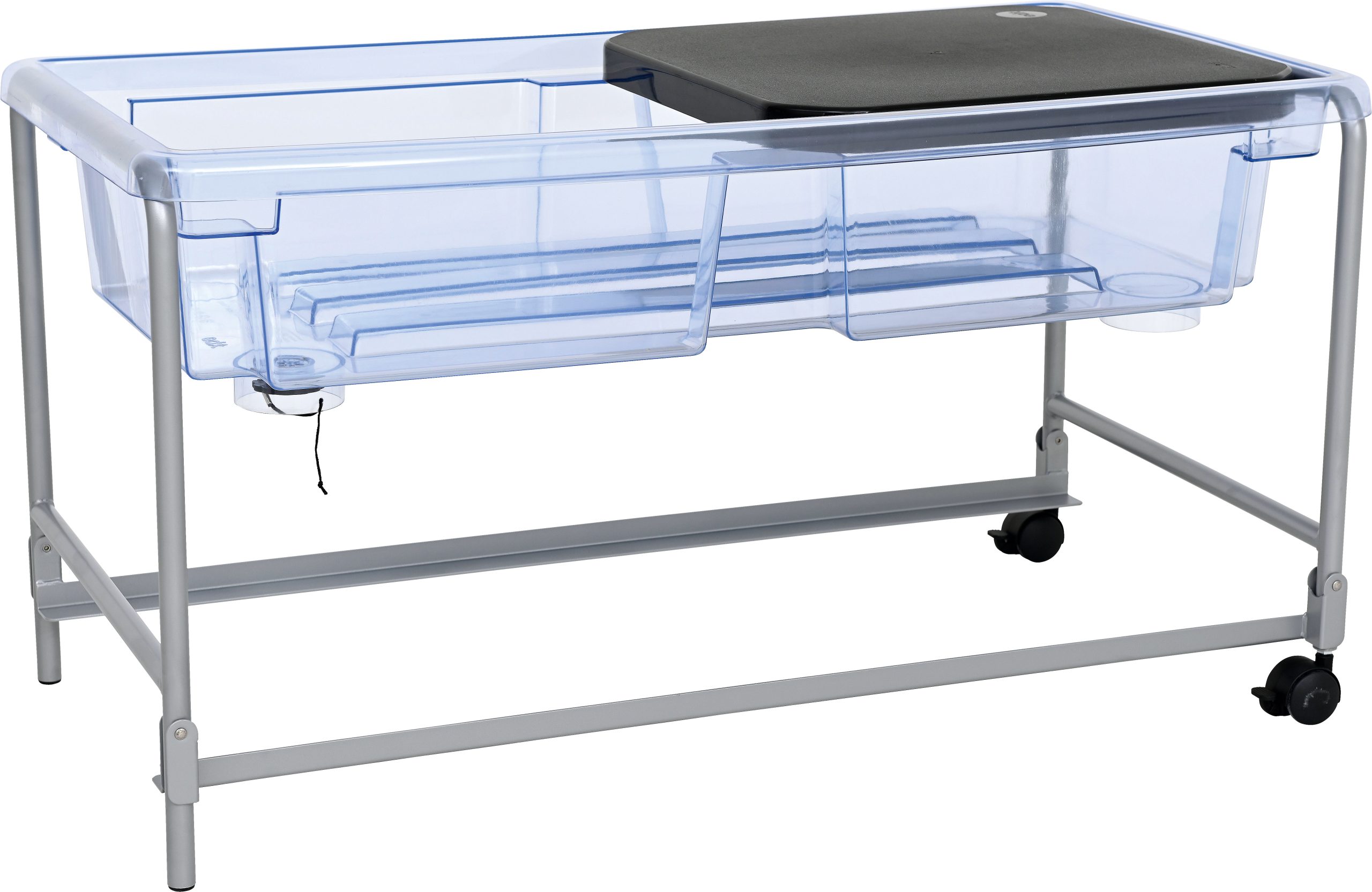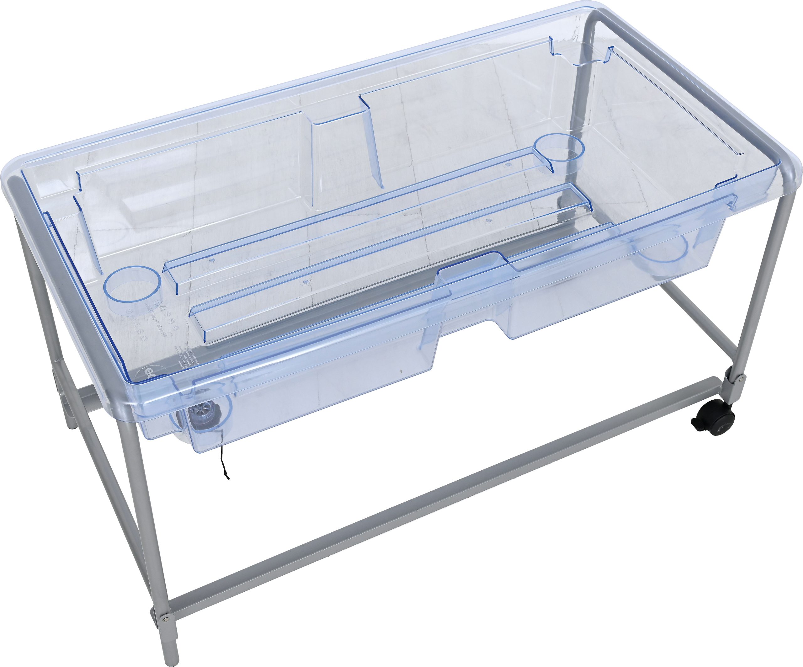 Vrlo čvrst, proziran i namjenski oblikovan stol za pijesak i vodu sa čeličnim, ali laganim postoljem. Kotačići s kočnicom omogućuju jednostavno pomicanje, dok poklopac osigurava da pijesak i voda ostanu čisti. Čep za ispuštanje vode omogućuje jednostavno i brzo čišćenje. Dolazi u setu s dva poklopca.