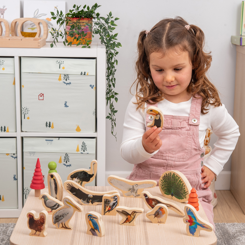 Masivni, a lagani blokovi sa slikama ptica savršeni su za dječju maštovitu igru te pomažu u razvoju jezičnih vještina. Blokovi su glatki su na dodir, laki za rukovanje, mogu stajati uspravno i složiti se. Izrađeni su od brezove šperploče, obostrano oslikani u boji sa stvarnim slikama ptica. Savršeno za djecu da se uključe u maštovitu igru, razviju svoje opisne jezične vještine i uče o različitim vrstama ptica iz cijelog svijeta. Realistične slike omogućit će mlađoj djeci naučiti imena i karakteristike različitih ptica, a stariju će djecu potaknuti na kreativno pripovijedanje ili pisanje i raspravljaju o pitanjima zaštite okoliša.