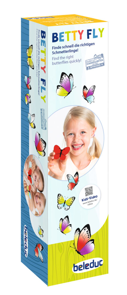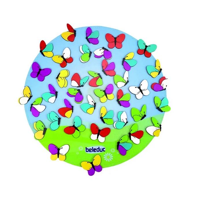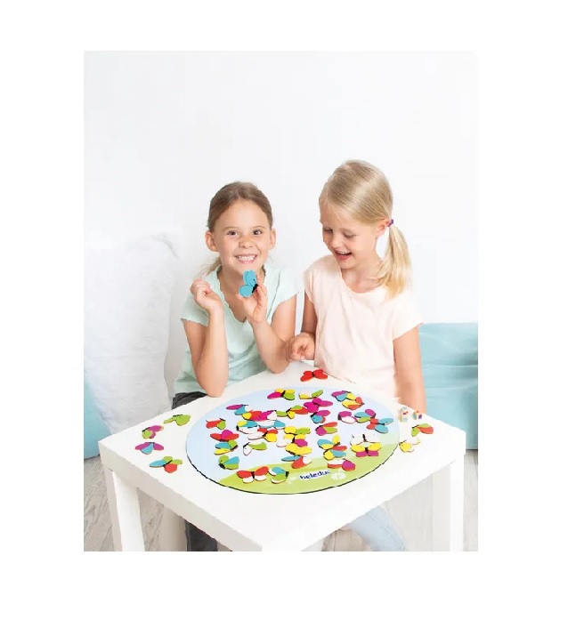 Igra u kojoj djeca moraju pronaći raznobojne leptire u što kraćem vremenu. Ova igra promiče vještine promatranja, finu motoriku i prepoznavanje boja. Igra sadrži: gumenu podlogu s tekstilnom površinom fi 45 cm, 41 šareno otisnut drveni leptir, 3 drvene kockice