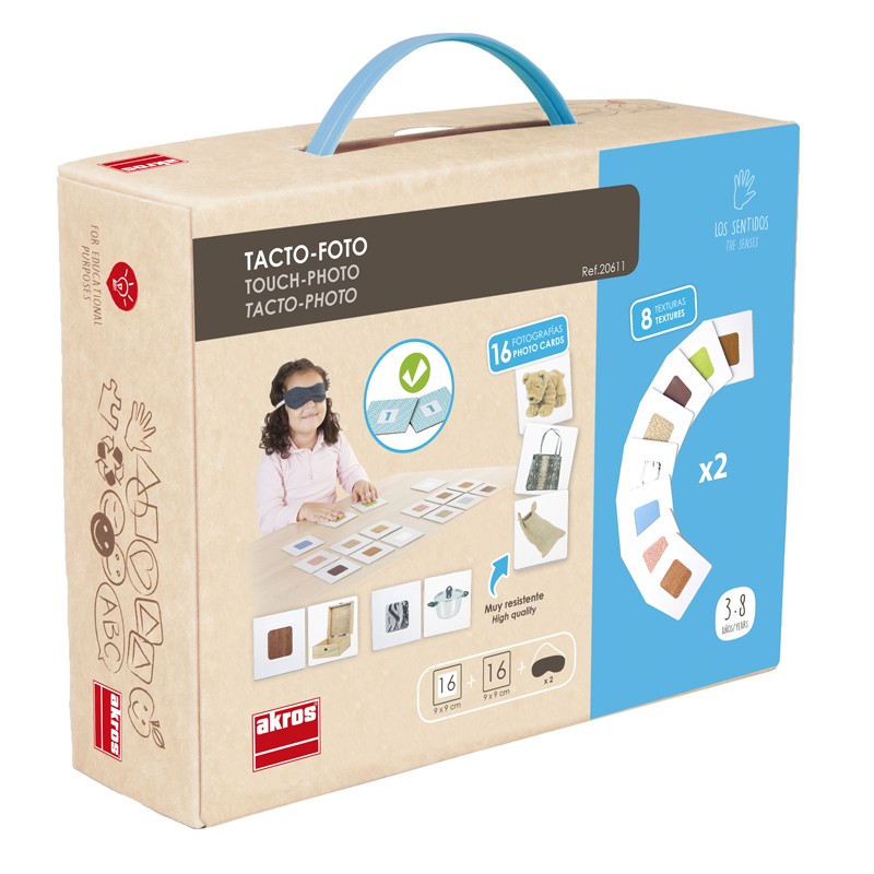 Tacto photo omogućava različite načine igre: igru memorije, igru komunikacije (postavljanje i odgovaranje na pitanja), igru opisivanja i raspoznavanja taktilnih materijala. Sastoji se od 16 kartica (9×9 cm) koje sadrže 8 tekstura iz svakodnevnog života (koža, drvo, pliš, metal, gaza, plastika, frotir i brusni papir) te 16 slika sa proizvodima izrađenim od tih materijala. Setovi kartica pakirani su u plastičnu kutiju i sadrže 2 poveza za oči te uputstva.