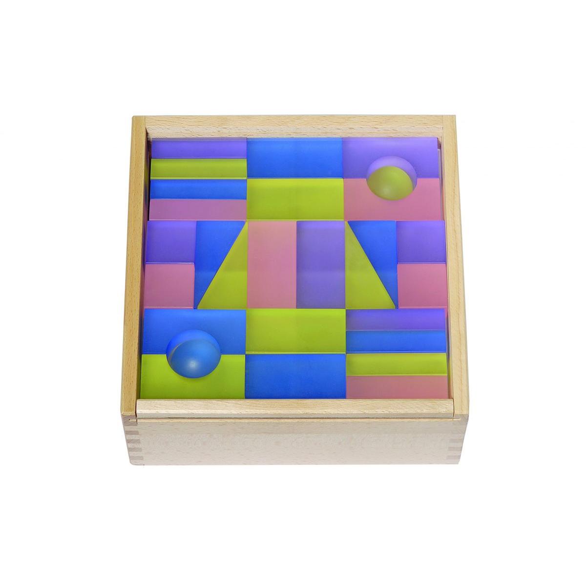 Set sadrži 84 građevna bloka (stupove, mostove, pravokutnike, polukrugove, kocke) u 4 pastelne boje (plava, žuta, roza, ljubičasta) i 14 prozirno-bijelih nosivih ploča. Pakirani su u drvenu kutiju (20,6×20,6×7 cm) s pomičnim prozirnim poklopcem.