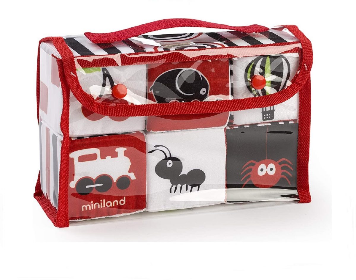 Šest mekih kocaka u vizualno stimulirajućim bojama. Kocke su oslikane raznovrsnim dezenima i jednostavnim i prepoznatljivim crtežima. Svaka kocka je ujedno i zvečka.