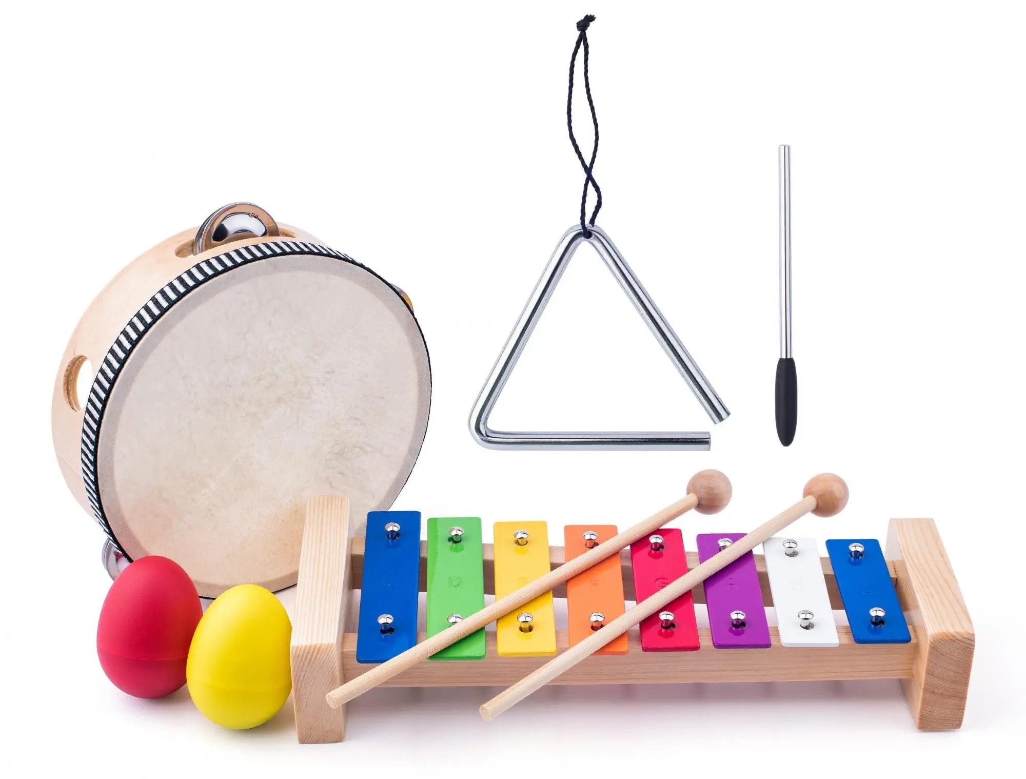 U ovom glazbenom setu zastupljeni su instrumenti iz nekoliko skupina. Udaraljke ovdje predstavlja ksilofon. Njegove metalne ploče postavljene su na filcane prstenove koji reguliraju oštrinu zvuka. Ritmičke instrumente predstavljaju marakas jaja. Na dubinu njihovog zvuka može se utjecati položajem držanja u dlanu. Predstavnici udaraljki su tamburin i triangl. On je na jednom od vrhova je podijeljen radi bolje rezonancije. Prilikom sviranja potrebno ga je objesiti na prste pomoću žice i tako spriječiti prigušivanje tonova. Trokut se kucka maljem koji je uključen u ovaj set. Duljina tona može se regulirati prigušivanjem prstiju. Set sadrži ukupno 4 instrumenta: ksilofon, tamburin, triangl i marakas jaja