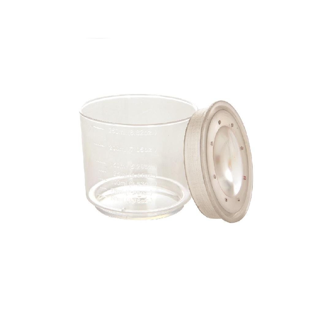 Klasična plastična posudica s povećalom na poklopcu i označenim mjernim jedinicama.