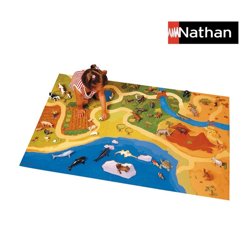 Velika podna prostirka ilustrira 4 različita prirodna okruženja (selo, šuma, savana, more) koji potiču maštu i igru. Figure životinja nisu sastavni dio seta.