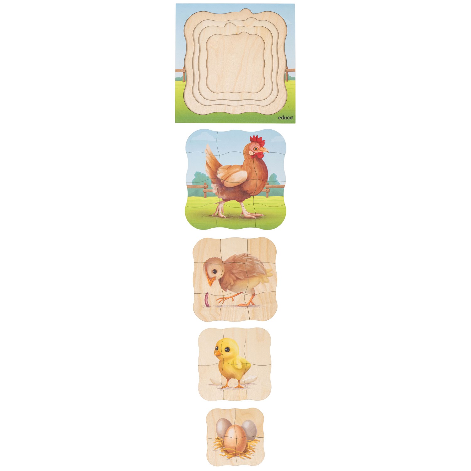 Slojevita slagalica na temu kokoši koja djeci pokazuje razvoj pileta do odrasle kokoši. Svaki od četiri sloja otkriva novu fazu: jaje, pile koje se izleglo, mlado pile koje raste i odrasla kokoš. Kada se sve slagalice iz serije slože jedna pored druge, može se stvorili kontinuirana priča o razvoju kokoši. Slojeviti, vizualni elementi slagalice pomažu djeci shvatiti razvoj na zanimljiv način. Slagalica uključuje: ploču za slaganje, slagalicu s 31 dijelom, izrađeno od održivog drva