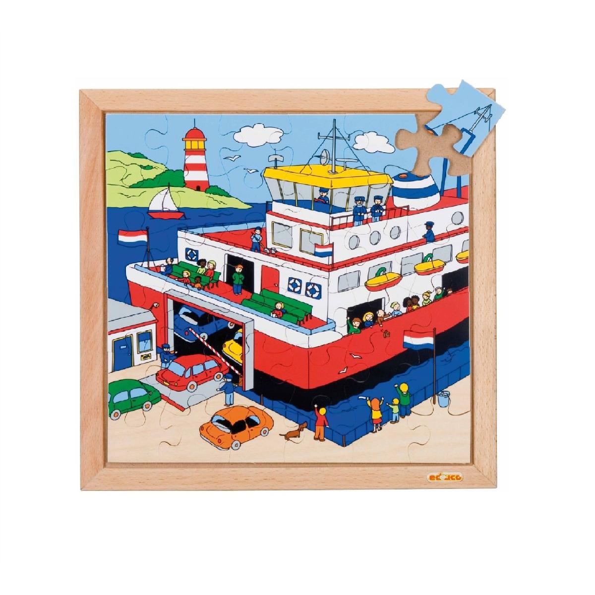 Drvene puzzle u drvenom okviru na temu trajektnog pristaništa.