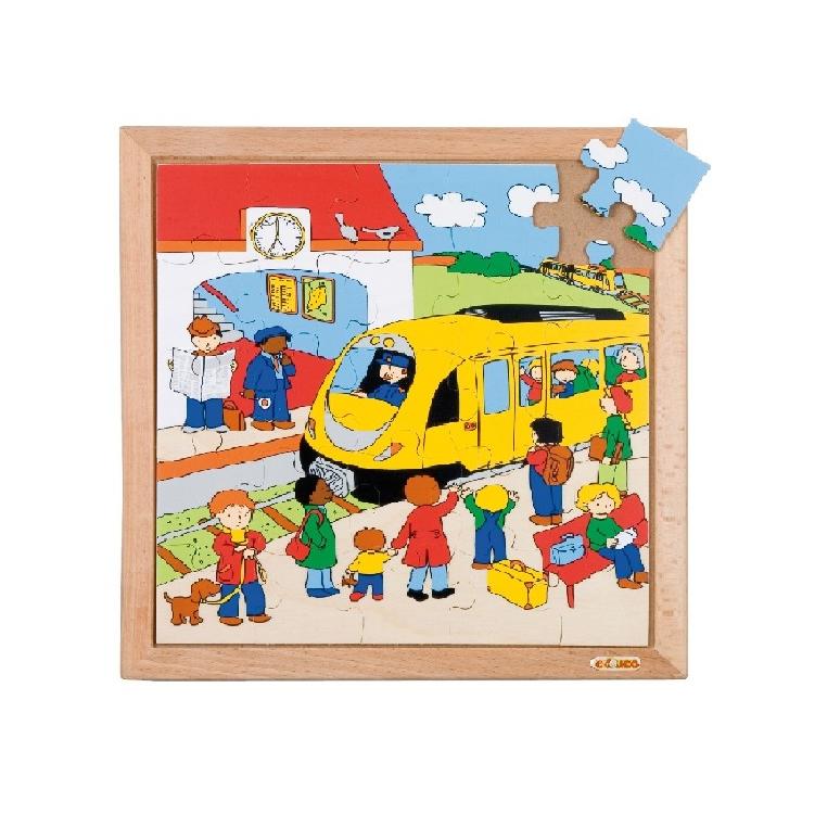 Drvene puzzle u drvenom okviru na temu željezničke postaje.