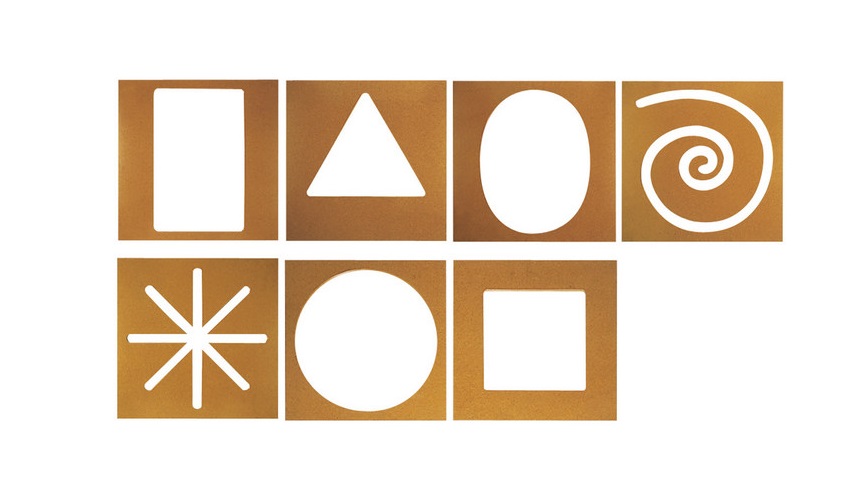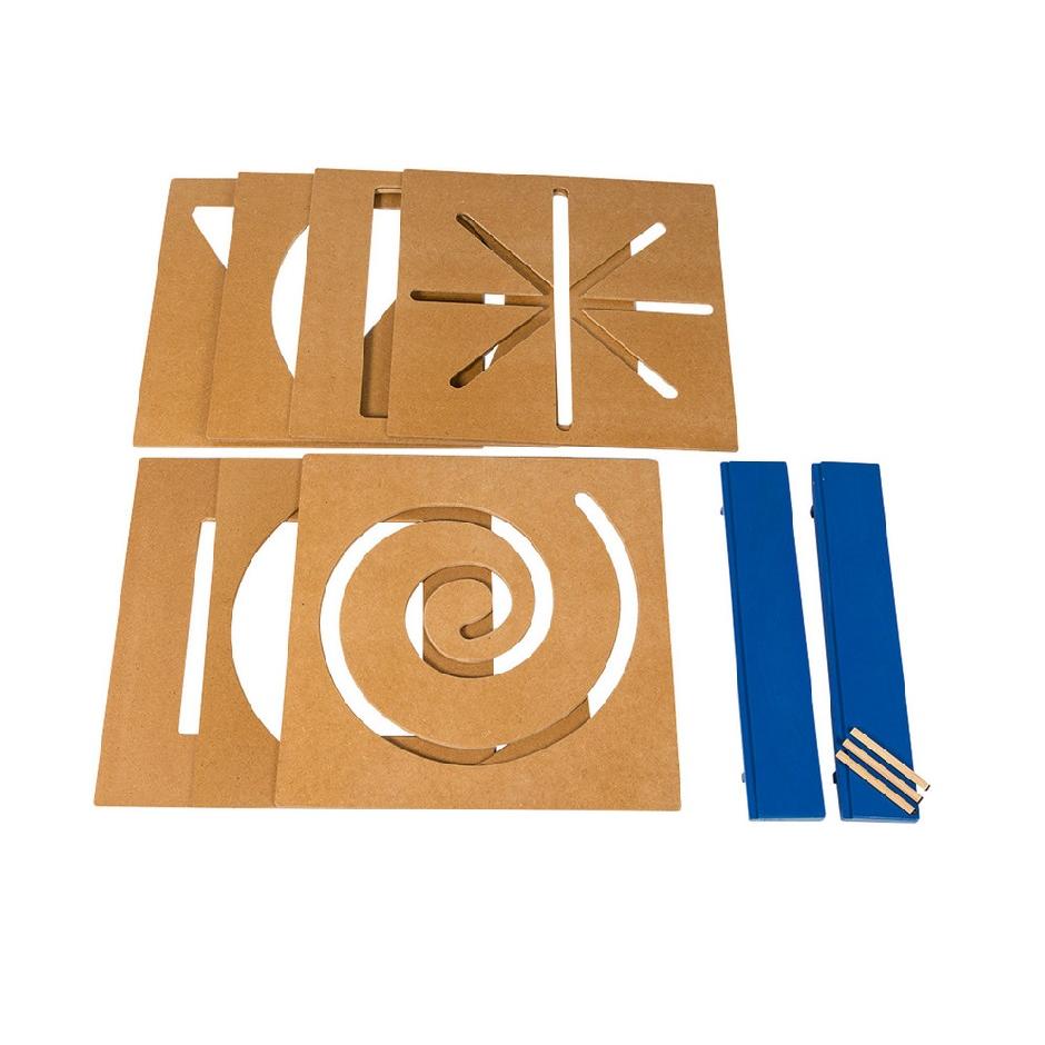 Set od 7 različitih šablona od lesonita (krug, kvadrat, trokut, oval, pravokutnik, vijak i zvijezda), 2 plave letvice i 3 olovke za pijesak za igre pijeskom. Rad s ovim predlošcima mandale djeci pruža taktilni doživljaj osnovnih geometrijskih oblika te tako na praktičan i kreativan način potiče razumijevanje simetrije i uzoraka. Artikl je inspiriran Montessori obrazovnim metodama.
