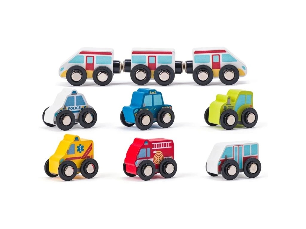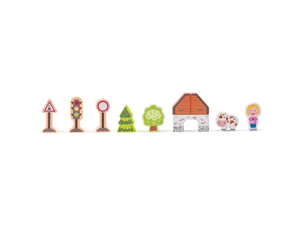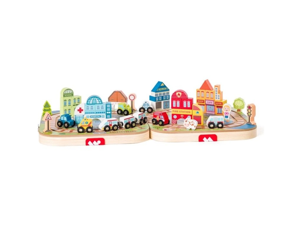 Otkrijte čarobni svijet vlakova skriven u drvenoj kutiji. Rasklapanjem kutije otkriva se gradski promet s precizno izrezanim drvenim tračnicama u obliku osmice. Set električnih vlakova, drveni vagoni i građevinski blokovi stvaraju jedinstveni set za igru. Dimenzije u rasklopljenom stanju: 62 x 32 cm. Broj dijelova: 55.