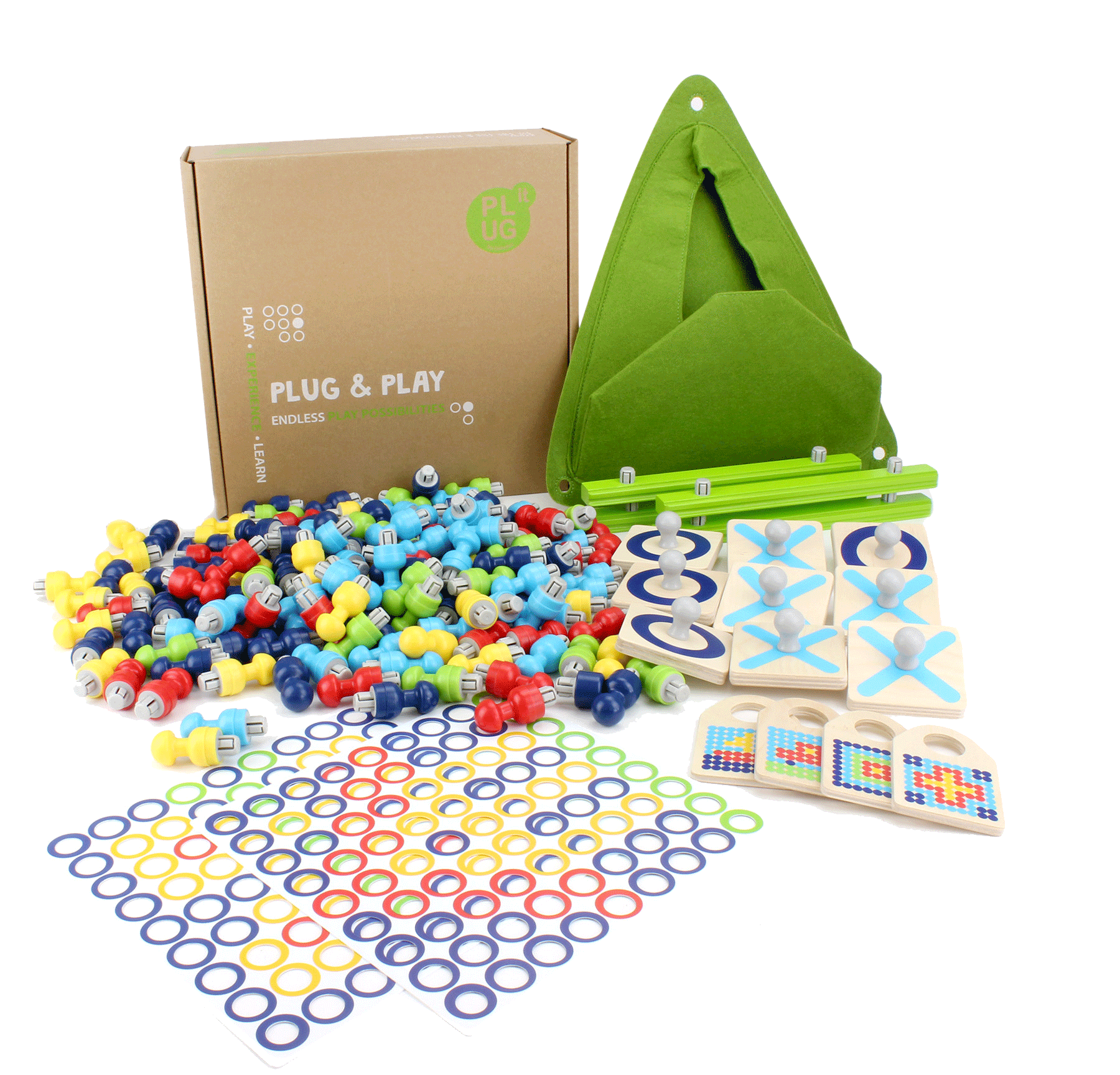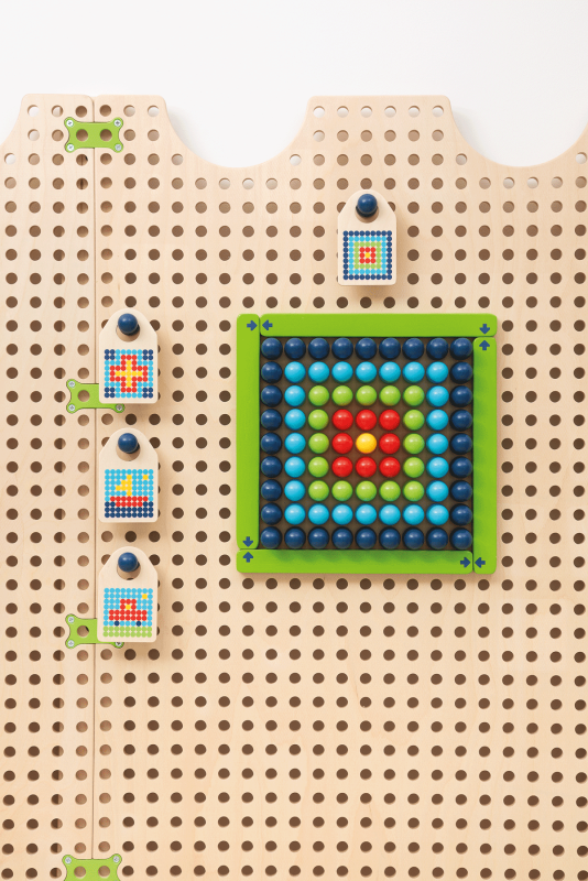 Set igara koji sadrži dvije igre: križić-kružić i zidni mozaik. Zeleni drveni okvir omeđuje i služi kao izmjenjivi okvir s predlošcima za mozaičnu igru. Ovaj set nudi mnogo mogućnosti igre za početno kodiranje ili za maštovite kreacije. S njim se dijete može koncentrirati samo kako bi prepoznalo uzorke i vježbalo finu motoriku ili grupa može razvijati složene slike kodiranja po cijelom zidu. S praktičnom zelenom filcanom vrećicom, štapići se mogu lako očistiti i pričvrstiti na mjesto gdje se igraju. Set uključuje: 4 zelena drvena dijela okvira, 9 dijelova križića-kružića, 2 folije s 4 predloška (s obje strane), 155 čepova za igru u 5 boja, 1 vrećicu za pohranu “Trokut” i
