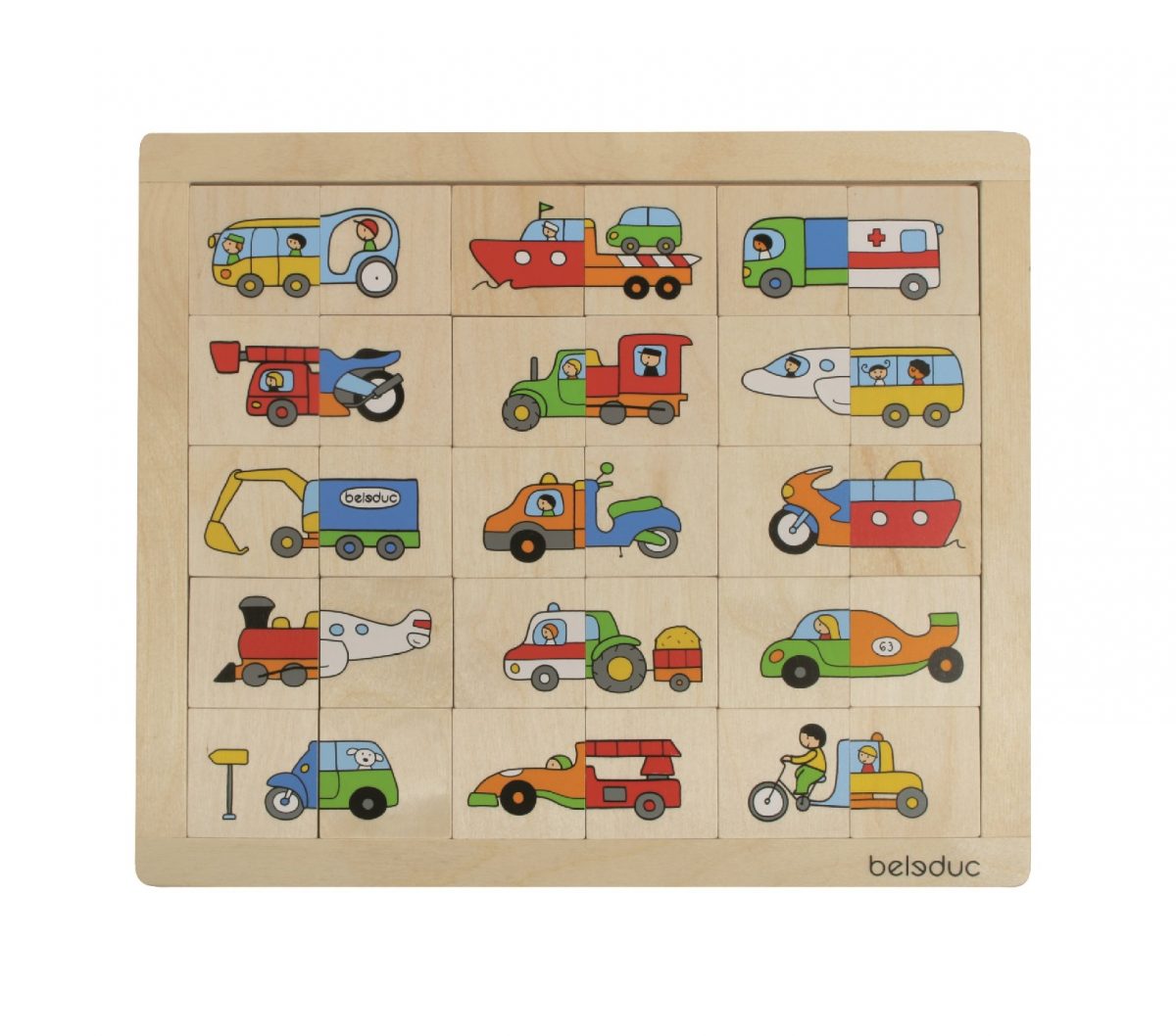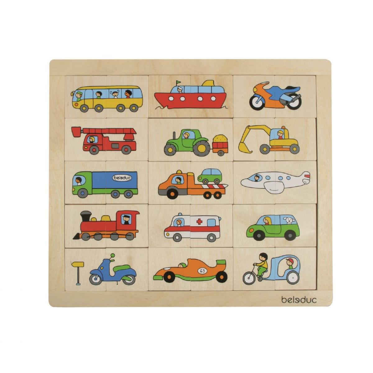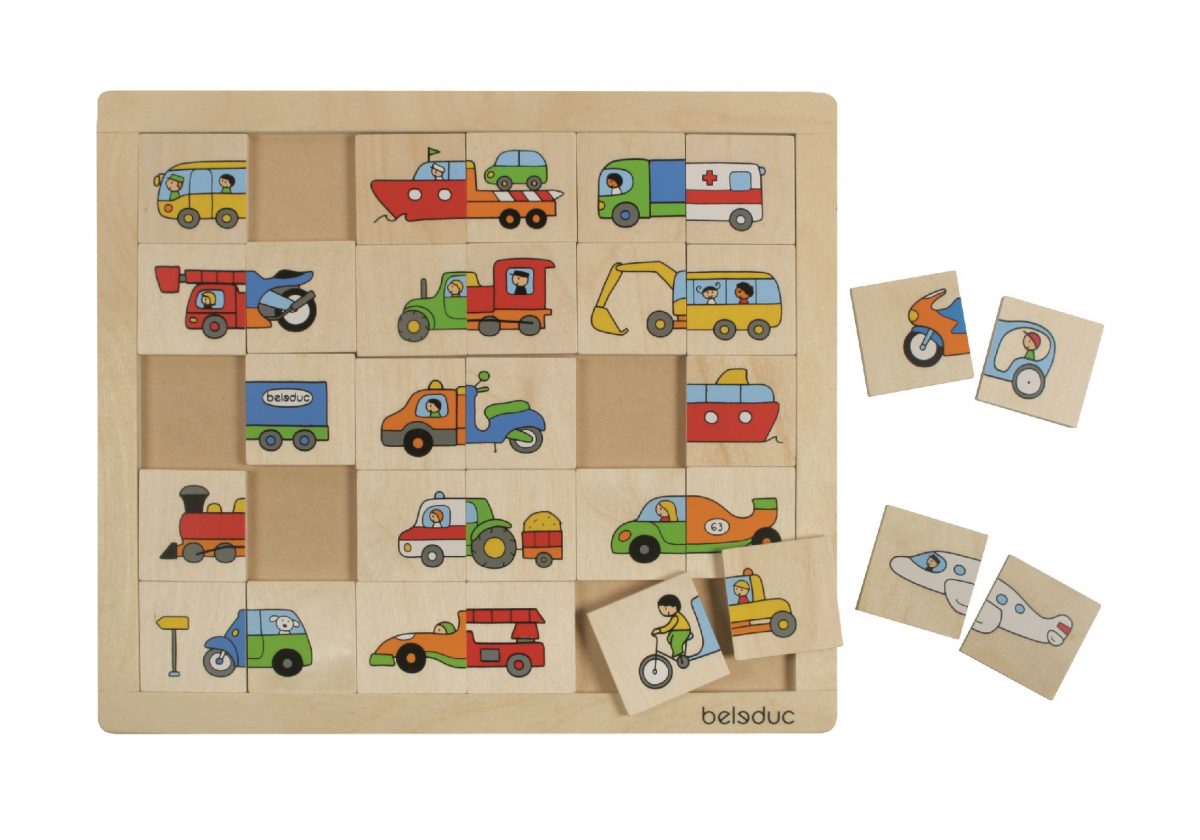 Drvena slagalica za najmlađe omogućavava različite načine igre: pronađi drugu polovicu para / pomiješaj dijelove i složi autić / igranje memory igre.