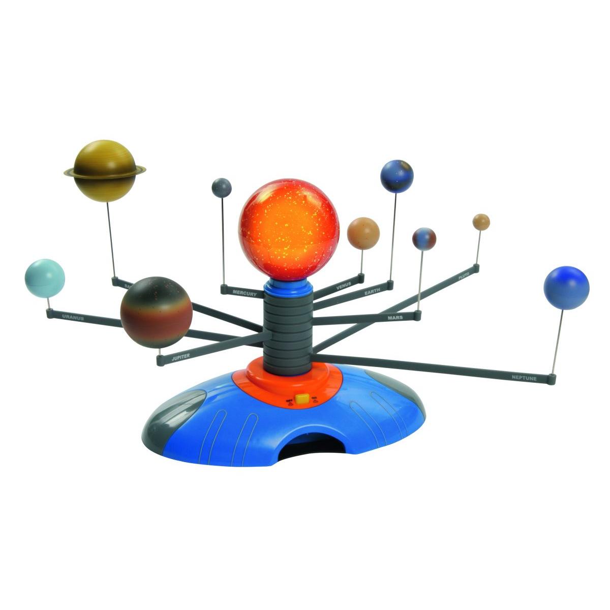 Edukativan sunčev sustav prikazuje Sunce (koje svijetli) i 8 planeta koji oko njega kruže: Merkur, Veneru, Zemlju, Mars, Jupiter, Saturn, Uran, Neptun te patuljasti planet Pluton. Rotiraju se automatski prilikom uključenja i imaju snimljeno glasovno objašnjenje (na engleskom). Baterije nisu u sklopu seta.