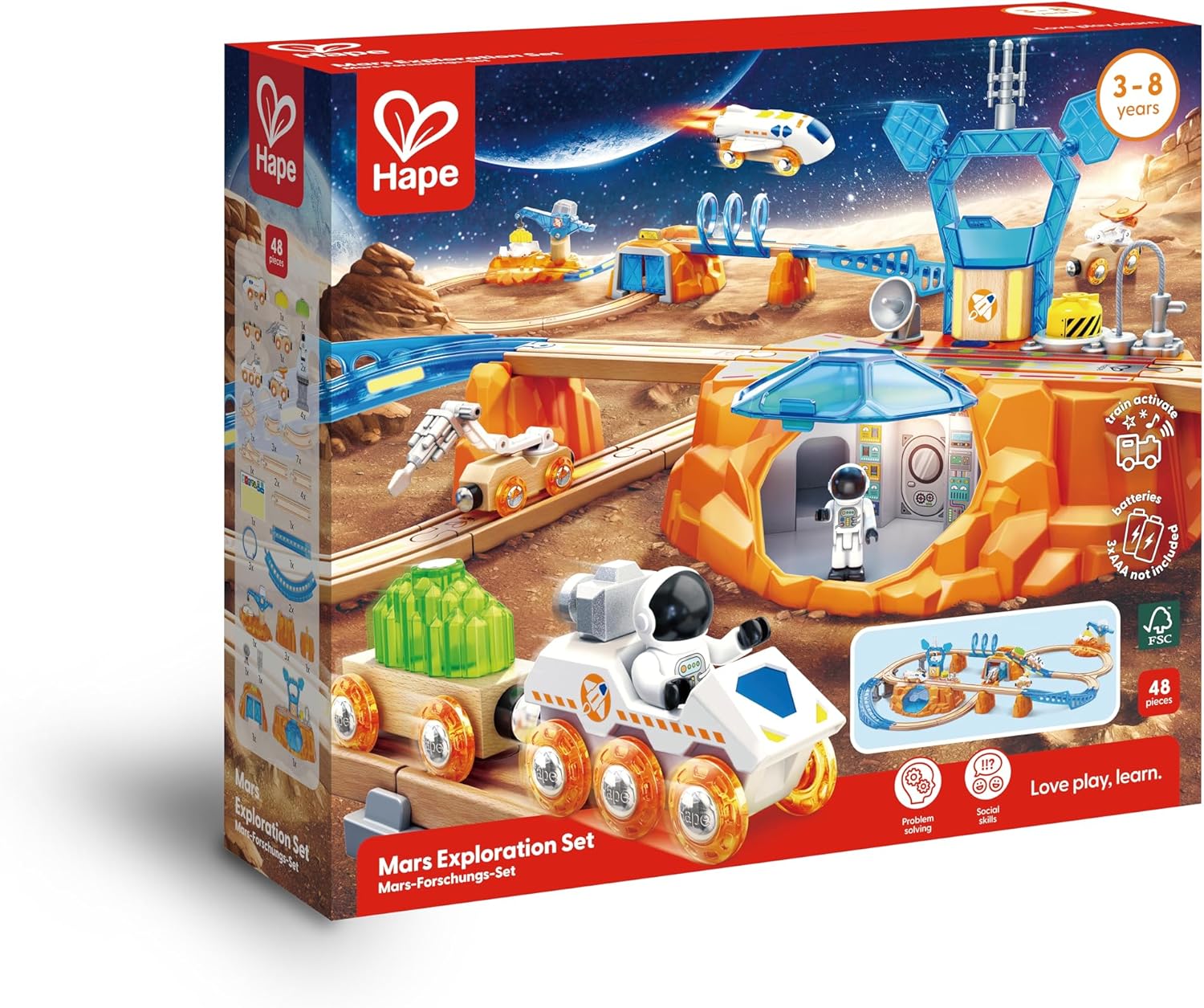 Krenite na svemirska putovanja s astronautima i zaronite u uzbudljive avanture vlakom s ovim očaravajućim setom, kombinirajući istraživanje željeznice i svemira. Ovaj set od 48 dijelova spaja zabavu gradnje željeznice s uzbuđenjem svemirskih misija. Djeca mogu sastavljati tračnice, koristiti svemirski vlak sa sklopivim krilima i istraživati višenamjensku bazu Mars s radarom, antenama i dizalicom. Set ima svjetla koja se aktiviraju senzorima na bazi Marsa i realistične zvučne efekte, naljepnice koje svijetle u mraku. Baza na Marsu sadrži laboratorij, parkirnu garažu, radar, uklonjive antene, solarne panele i stanicu za punjenje gorivom za beskrajne mogućnosti igre. Dimenzija: 88 x 20 x 93.9 cm