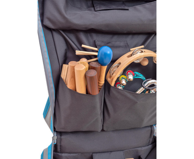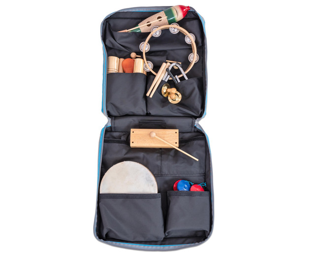 Praktična torba s 26 instrumenata, lako prenosiva, sa džepićima za brzo i jednostavno spremanje. U pregradama pronaći ćete instrumente različitih tonova za brojne glazbene aktivnosti (tamburine, triangle, drvene marakase, kastanjete, klavese, zvončiće…)