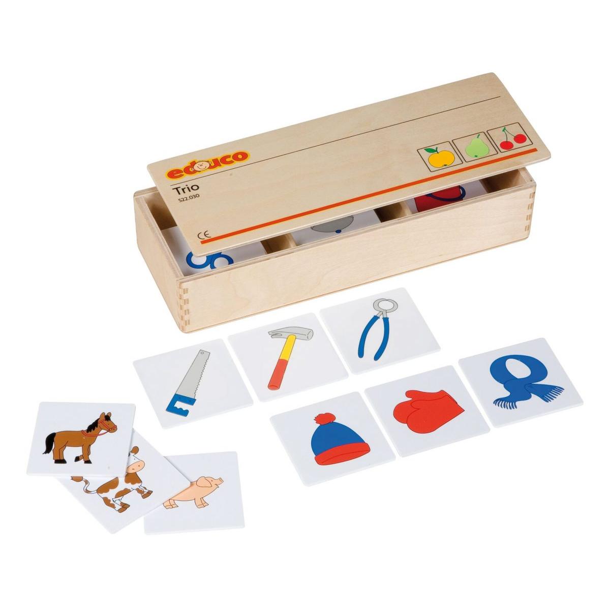 Igra se sastoji od 48 plastičnih kartica koje treba posložiti u setove od 3 međusobno povezane kartice. Npr. šal, kapa i rukavice su dijelovi zimske odjeće, djeca ih trebaju pronaći i opisati zašto su srodne. TRIO je odlična igra za razvoj logičkog razmišljanja, učenje pojma klasificiranja te usvajanja novih riječi i korištenje u pravom konteksu. Dimenzije: kartice (8×8 cm), kutija (33x12x6 cm)