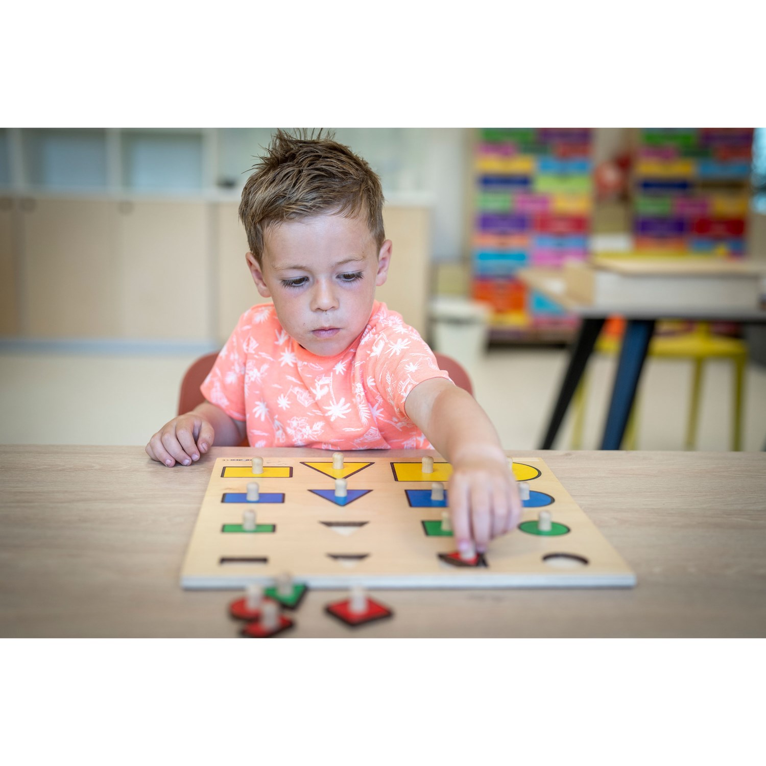 Drvena umetaljka na ploči, sastoji se od geometrijskih oblika različitih veličina i boja.