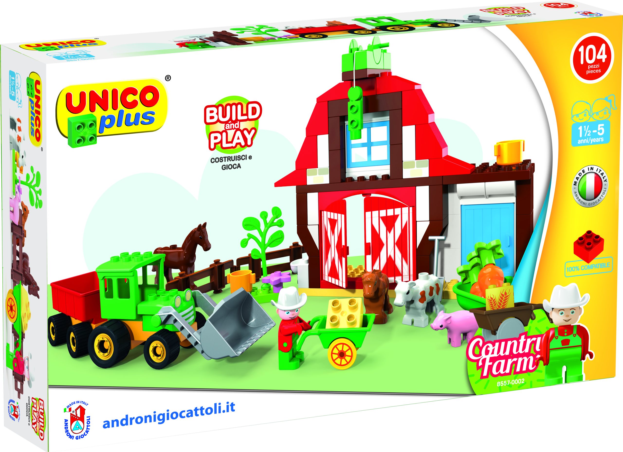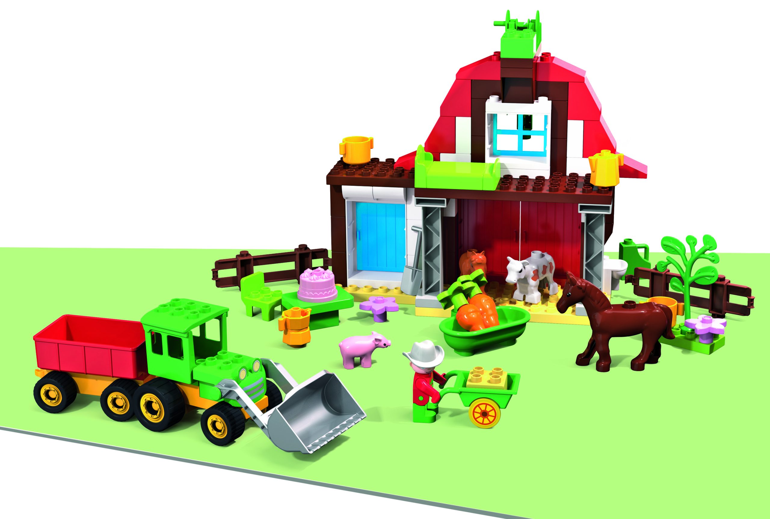 Komplet kocaka uz koje će se djeca zabaviti, razvijati maštu i uvježbati finu motoriku. Set kocaka sadrži velike plastične kocke od kvalitetne plastike koja ne sadrži štetne materije. Uključena je velika farma s dizalicom sa sajlom, traktorom s bagerom i prikolicom, figura farmera, životinje i još mnogo toga