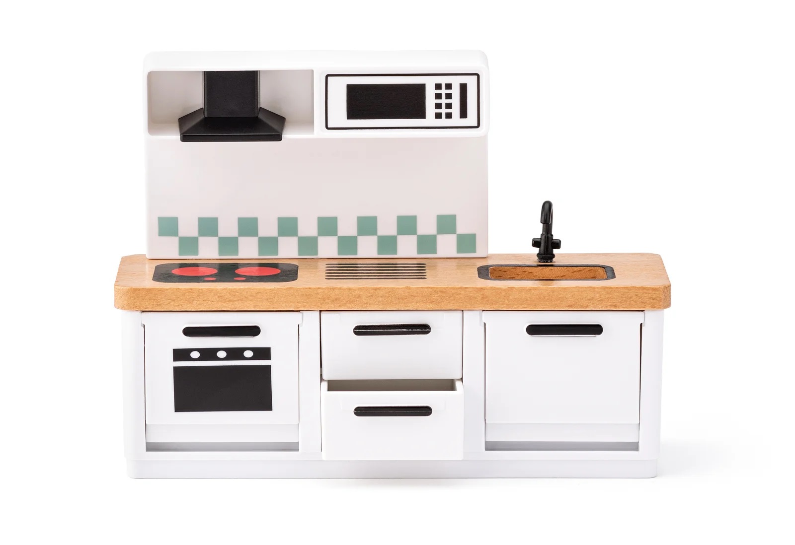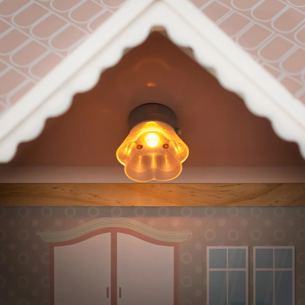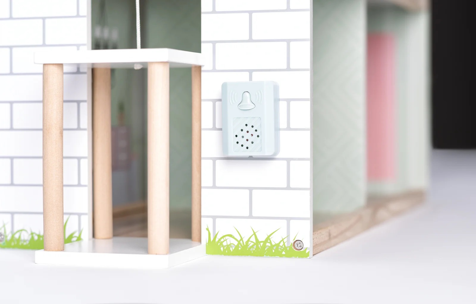 Kvalitetna drvena kućica za lutke na tri kata. Lutke mogu koristiti lift od podruma do prvog kata. Pristup trećem katu je unutarnjim stubištem. Na kućici se nalazi zvono. Treći kat je opremljen ne samo prostranom terasom i tendom, već i funkcionalnom rasvjetom. Kućica za lutke uključuje svu dodatnu opremu prikazanu na slici. Nameštaj je napravljen od kombinacije drveta i plastike.  Dimenzije: 64 x 31 x 80 cm