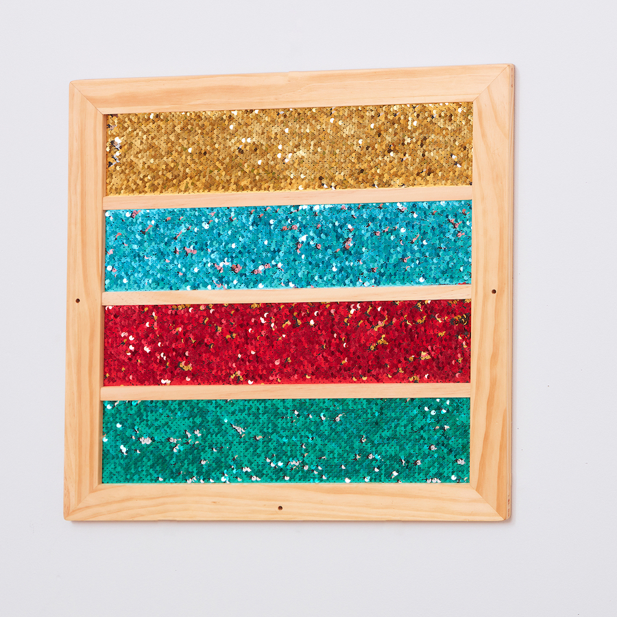 Ploča sadrži 4 trake s različitim šljokicama. Prelazeći rukom preko njih, boje se mijenjaju što rezultira i izmijenjenim izgledom cijele slike. Ploča je dizajnirana za senzornu igru i razvoj finih motoričkih vještina. Prostor na ploči pruža dovoljno površine za stvaranje različitih oblika, otkrivajući ispod skrivene boje šljokica te pritom pruža umirujuće osjetilno iskustvo. Drvena ploča je dim. 50 x 50 cm, debljine 1,5 cm, dolazi s izbušenim rupama, ali bez pribora za montažu.