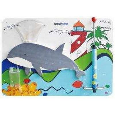 Vesela i interaktivna zidna ploča koja potiče djecu da nauče koliko snažno je potrebno potiskivati pumpu za vodu.