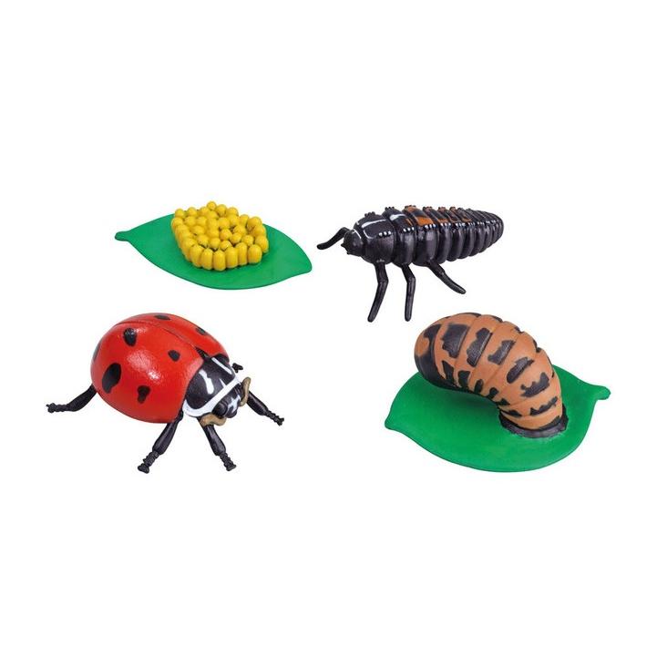 4-djelni set koji prikazuje životni ciklus razvoja bubamare, od polaganja jajašca na list, razvoja ličinke do bubamare.